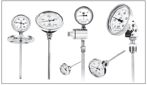 測量氣體和液體的溫度。與玻璃溫度計相比,它具有無汞損壞、讀數清晰、堅固耐用的優點。我生產多用途雙金屬溫度計,規格品種齊全,質量穩定可靠,可廣泛應用于工業、農業、國防和科研領域的各個部門。雙金屬溫度計結構特點和工作原理雙金屬 溫度計(以下簡稱溫度計)使用螺旋加熱器雙金屬板作為溫度傳感元件,并將其安裝在保護套中,一端固定(固定端),另一端(自由端)連接到薄軸上,軸端帶有指針。當溫度變化時,溫度傳感元件的自由端立即旋轉,并通過細軸驅動指針以指示刻度盤上的溫度變化。直行溫度計通過轉向傳動機構驅動指針。外殼材料包括鋼板、鑄造鋁合金和不銹鋼板??烧{角度溫度計的頭部可借助波紋管、轉角機構和其他部件從角度調整為直線或從直線調整為角度。